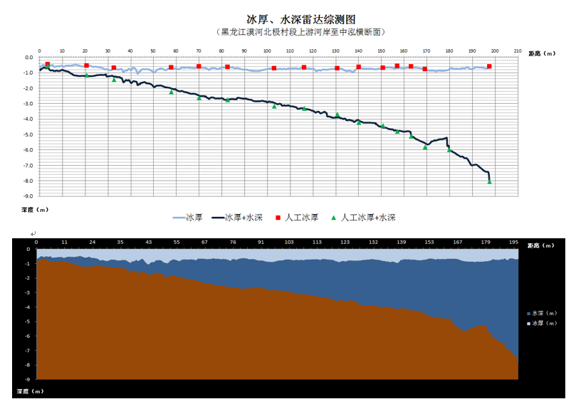 圖3 雷達(dá)獲取的高精度冰厚水深綜合斷面圖(與傳統(tǒng)方法測(cè)量數(shù)字比對(duì),測(cè)量結(jié)果更精準(zhǔn))